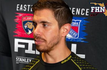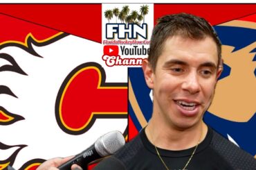 L’attaquant des Panthers de la Floride, Evan Rodrigues, parle après que son équipe a battu les Flames de Calgary en…
