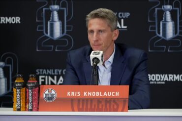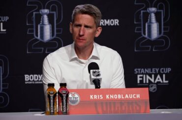 Kris parle avec les médias après la défaite des Oilers 6-1 contre les Panthers dans le match 3 de la…