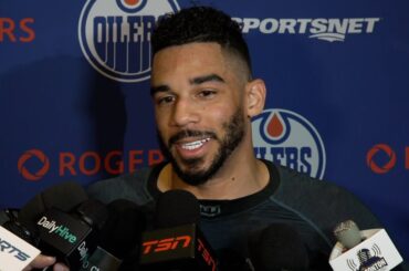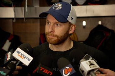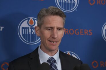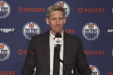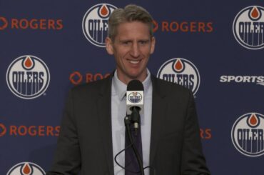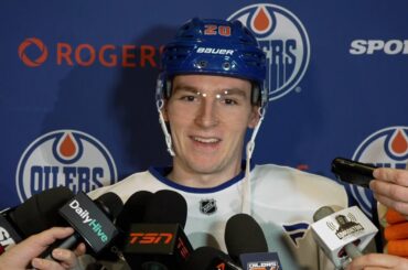 Quinn discute avec les médias avant de faire ses débuts sur les Oilers lundi après avoir signé son contrat d’entrée…