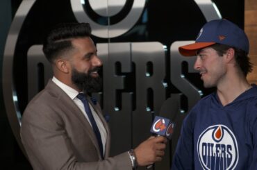 Evan parle aux médias après avoir signé une prolongation de contrat de quatre ans avec les Oilers lundi.