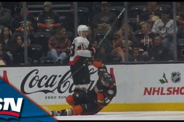 Regardez ça, alors que l’attaquant des Sénateurs Tim Stutzle frappe Simon Benoit des Ducks au visage avec le bout de…