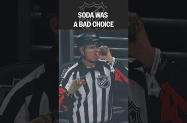 Habillé en arbitre de la LNH, l’acteur Will Ferrell savoure une bonne gorgée de soda à la fin du match…