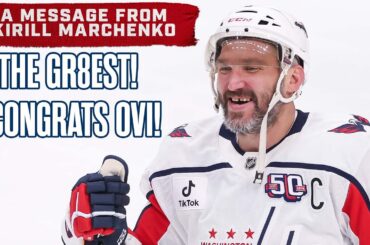 Kirill Marchenko félicite Alex Ovechkin pour avoir battu le record de Wayne Gretzky pour la plupart des objectifs de carrière.…