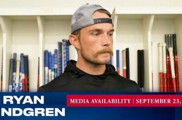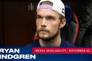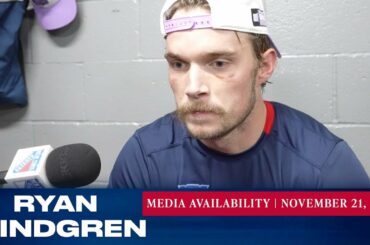 Le défenseur des Rangers de New York Ryan Lindgren répond aux questions des médias après l’entraînement du 21 novembre. »…