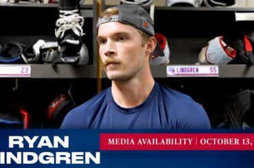Le défenseur des Rangers de New York Ryan Lindgren répond aux questions des médias avant le match du 13 octobre…