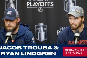 Le défenseur des Rangers de New York Jacob Trouba et Ryan Lindgren répondent aux questions des médias après le match…
