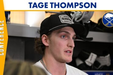 L’attaquant des Sabres de Buffalo, Tage Thompson, s’adresse aux médias à la fin de la saison 2022-23 des Sabres de…
