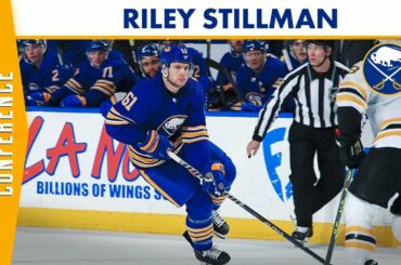 Le défenseur des Sabres de Buffalo Riley Stillman s’adresse aux médias après la défaite des Sabres contre les Bruins de…