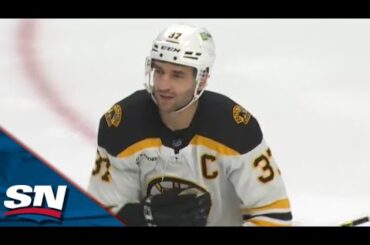 Regardez le capitaine des Bruins de Boston, Patrice Bergeron, lancer son équipe du bon pied, battant le gardien des Sabres…