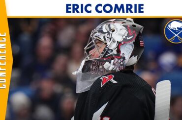Le gardien de but des Sabres de Buffalo, Eric Comrie, rencontre les médias après que les Sabres ont vaincu le…