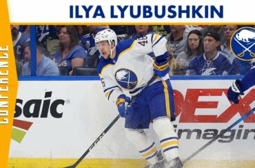 Ilya Lyubushkin s’adresse aux médias après que les Sabres de Buffalo ont battu le Lightning de Tampa Bay 6-5 en…
