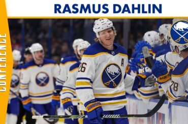 Rasmus Dahlin s’adresse aux médias après que les Sabres de Buffalo ont battu le Lightning de Tampa Bay 6-5 en…