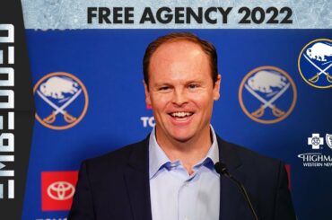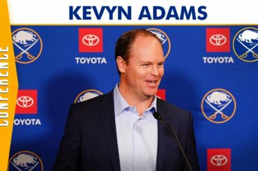 Le directeur général des Buffalo Sabres, Kevyn Adams, s’adresse aux médias après la prolongation de son contrat et le début…