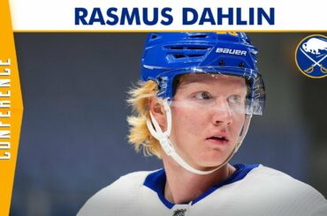 Le défenseur des Sabres de Buffalo, Rasmus Dahlin, s’adresse aux médias lors de la première journée du camp d’entraînement des…