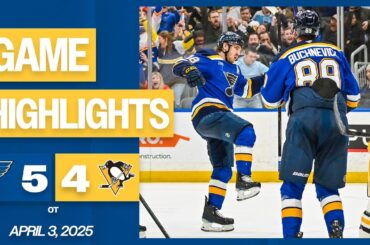 In @Blues de Saint-Louis Faits saillants du jeu: Blues 5, Penguins 4 (OT) avril 4, 2025 Robert Thomas a marqué en prolongation pour assurer la victoire et prolonger la séquence de victoires des Blues de St.…