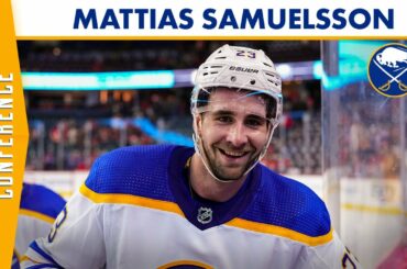 Le défenseur des Sabres de Buffalo, Mattias Samuelsson, s’est adressé aux médias le 15 décembre 2022 après la victoire de…