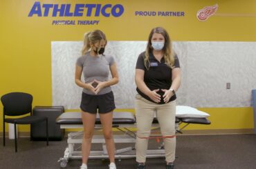 La kinésithérapeute Athletico, Nichole, se joint à l’animatrice In-Arena des Detroit Red Wings, Carley, pour faire la démonstration d’un squat…