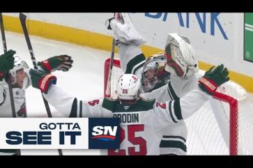 Regardez Filip Gustavsson du Minnesota Wild le retourner dans le filet vide pour enregistrer le premier but du gardien de…