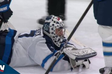 Regardez le gardien des Jets de Winnipeg, Connor Hellebuyck, s’étirer pour effectuer un superbe arrêt sur la superstar des Blackhawks…