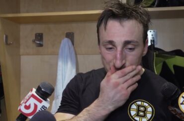 L’entraîneur-chef des Bruins, Jim Montgomery, et certains joueurs discutent avec les médias après la défaite des Bruins contre les Maple…