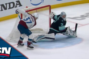 Regardez le gardien de but du Seattle Kraken Philipp Grubauer voler l’attaquant de l’Avalanche du Colorado JT Compher sur le…