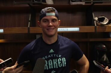 L’attaquant et capitaine adjoint du Seattle Kraken Jordan Eberle s’entretient avec les médias après une victoire contre Nashville.