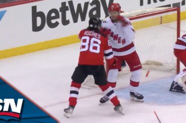 Regardez Jack Hughes des Devils du New Jersey et Sebastian Aho des Hurricanes de la Caroline disputer un match de…