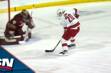 Regardez l’attaquant des Hurricanes de la Caroline Sebastian Aho ramasser la rondelle à sa propre ligne bleue et montrer sa…