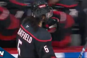 Regardez le défenseur des Hurricanes de Caroline, Jalen Chatfield, envoie une explosion du point et à travers la circulation pour…