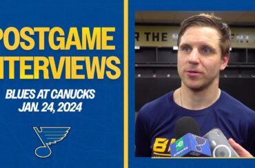 Brayden Schenn, Joel Hofer et Drew Bannister parlent aux médias après une victoire en prolongation à Vancouver le 24 janvier…