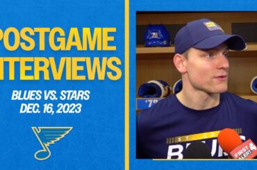 Le défenseur des Blues de St. Louis Colton Parayko, l’attaquant Jordan Kyrou et l’entraîneur-chef par intérim Drew Bannister rencontrent les…
