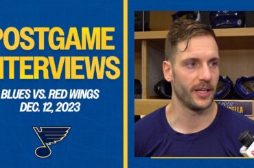 L’attaquant des Blues de St. Louis Kevin Hayes, le défenseur Marco Scandella et l’entraîneur-chef Craig Berube rencontrent les médias à…