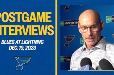 Le défenseur des Blues de St. Louis Colton Parayko, l’attaquant Brayden Schenn et l’entraîneur Drew Bannister rencontrent les médias à…