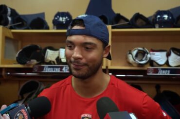 Le défenseur des Panthers de la Floride Seth Jones s’exprime après la défaite de son équipe 3-2 contre les Ducks…