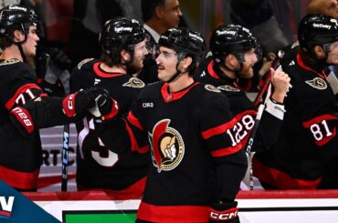 Shane Pinto des Sénateurs d’Ottawa profite d’une tentative de dégagement ratée avec un tir sur réception dans l’enclave, brisant l’égalité…