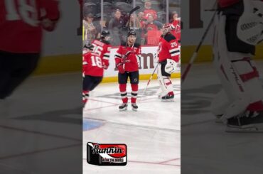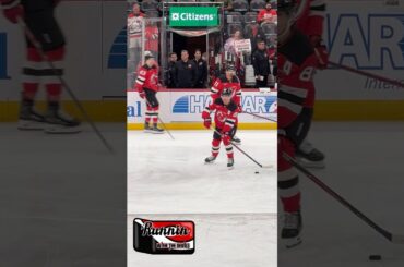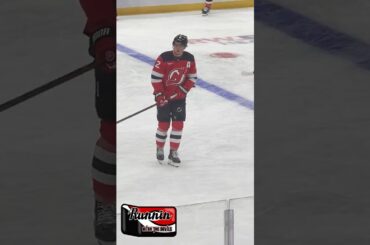 L’attaquant des Devils du New Jersey Dawson Mercer lors des échauffements avant le jeu NJ Devils vs NY Islanders au…