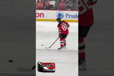 L’attaquant des Devils du New Jersey Jack Hughes lors des échauffements avant le jeu NJ Devils vs NY Islanders au…