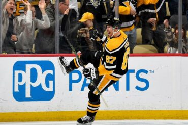 Sidney Crosby marque un but serré après avoir reçu une passe de Jake Guentzel sur son patin et l’avoir frappé…
