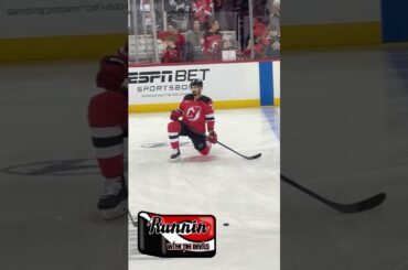 Le défenseur du New Jersey Devils Jonas Siegenthaler s’étend lors des échauffements avant le match 3 de NJ Devils vs…