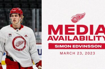 Le défenseur des Red Wings Simon Edvinsson s’entretient avec les médias après l’entraînement des Red Wings au Little Caesars Arena…