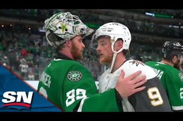 Regardez les Golden Knights de Vegas et les Stars de Dallas échanger des poignées de main, alors que Vegas empêche…