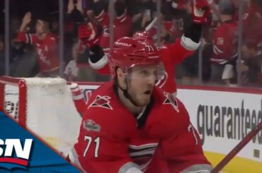 Regardez l’attaquant des Hurricanes de la Caroline Jesper Fast renvoyer à la maison un tir de Jesperi Kotkaniemi en avantage…