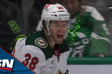 Regardez l’attaquant du Wild du Minnesota Ryan Hartman prendre la rondelle au filet et la retourner devant le gardien des…