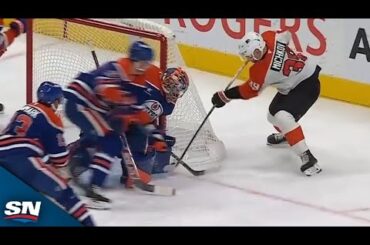 Regardez Matvei Michkov des Flyers de Philadelphie marquer son premier but en carrière dans la LNH devant la jambière du…