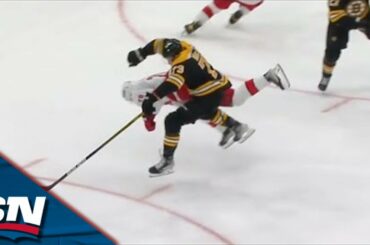 Regardez le défenseur des Bruins de Boston Charlie McAvoy attraper l’attaquant des Hurricanes de la Caroline Sebastian Aho avec un…