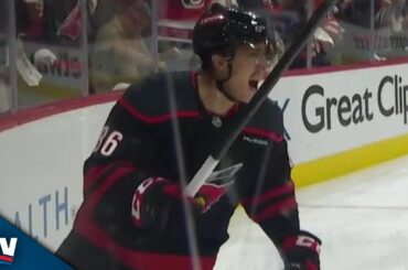 Sebastian Aho fait le tour du filet et prend le corner sur une passe d’Andrei Svechnikov pour donner une avance…