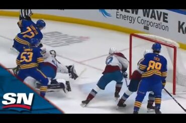 Regardez l’attaquant des Sabres de Buffalo Tage Thompson attendre le gardien de but de l’Avalanche du Colorado Alexander Georgiev avant…