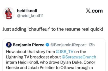 *Heidi Knoll, stagiaire à Syracuse Crunch, qui joue en avant pour l’équipe de hockey de l’Université de Syracuse. On dirait…