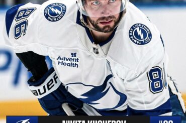 L’attaquant du Lightning de Tampa Bay Nikita Kucherov décoche un tir sur réception hurlant au fond des filets pour son…