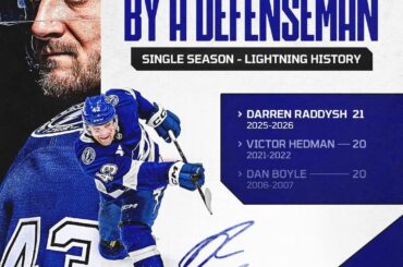 Regardez Darren Raddysh marquer contre les Bruins de Boston, établissant ainsi le record du Lightning de Tampa Bay pour le…